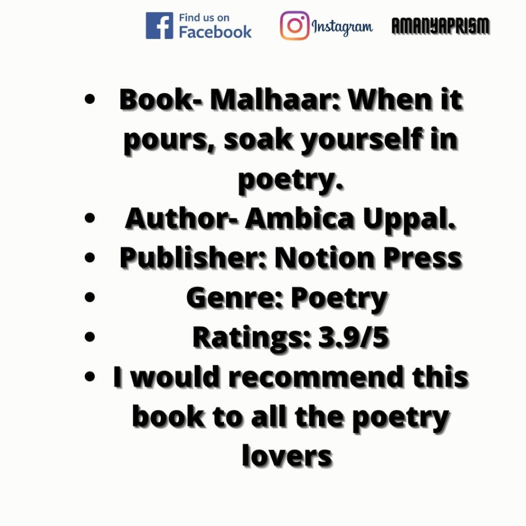 💮 Malhaar Was a Collection of verse beautifully penned by the author Ambica Uppal, in a very easy way so everyone can relate to the poetry.